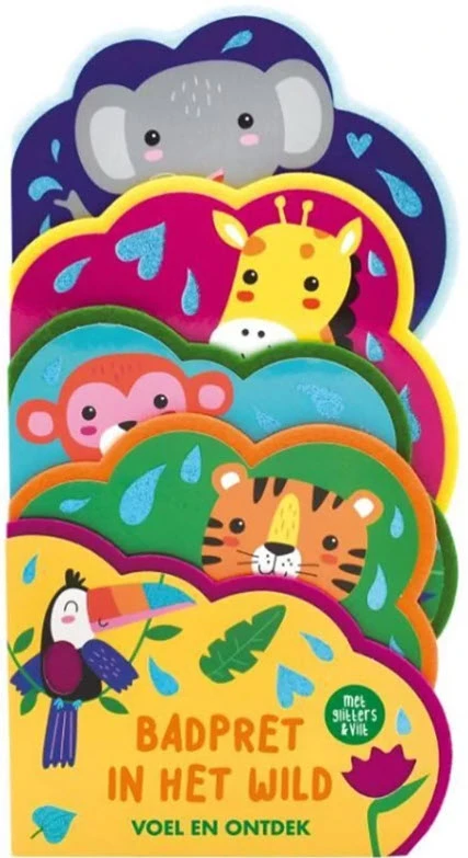 Feest op de boerderij is een kartonnen voelboek met details van vilt en glitter. Het regent bloemetjes op de boerderij, en de dieren weten niet waarom.