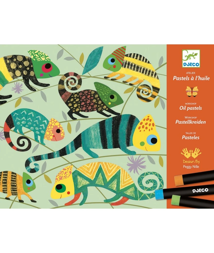 Atelier waskrijtjes van het Franse merk DJECO. Deze set bevat 12 waskrijtjes in mooie heldere kleuren, 4 voorgedrukte kartonnen platen om je mooiste kunstwerken op te kleuren, heel veel sjablonen, een kwastje, een placemat en een kraspen.