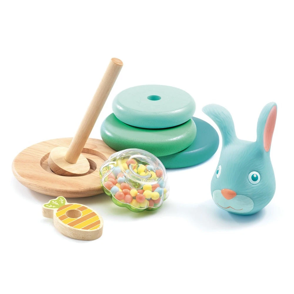 DJECO stapeltoren Cascarott konijn, een mooie stapeltoren in de vorm van een grappig kkonijn. Het stapelen van de ringengoed voor de motoriek van je kleintje.