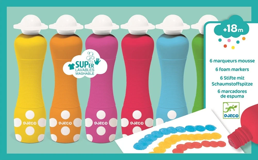 6 Verschillende kleuren stempel verf van DJECO, veilig Ên uitwasbaar. Foam markers zijn flesjes met een foam bovenzijde. Hieruit komt verf wanneer je erin knijpt of er mee stempelt. Gebruik de markers om een mooie kunstwerk te stempelen of een tekening te decoreren.