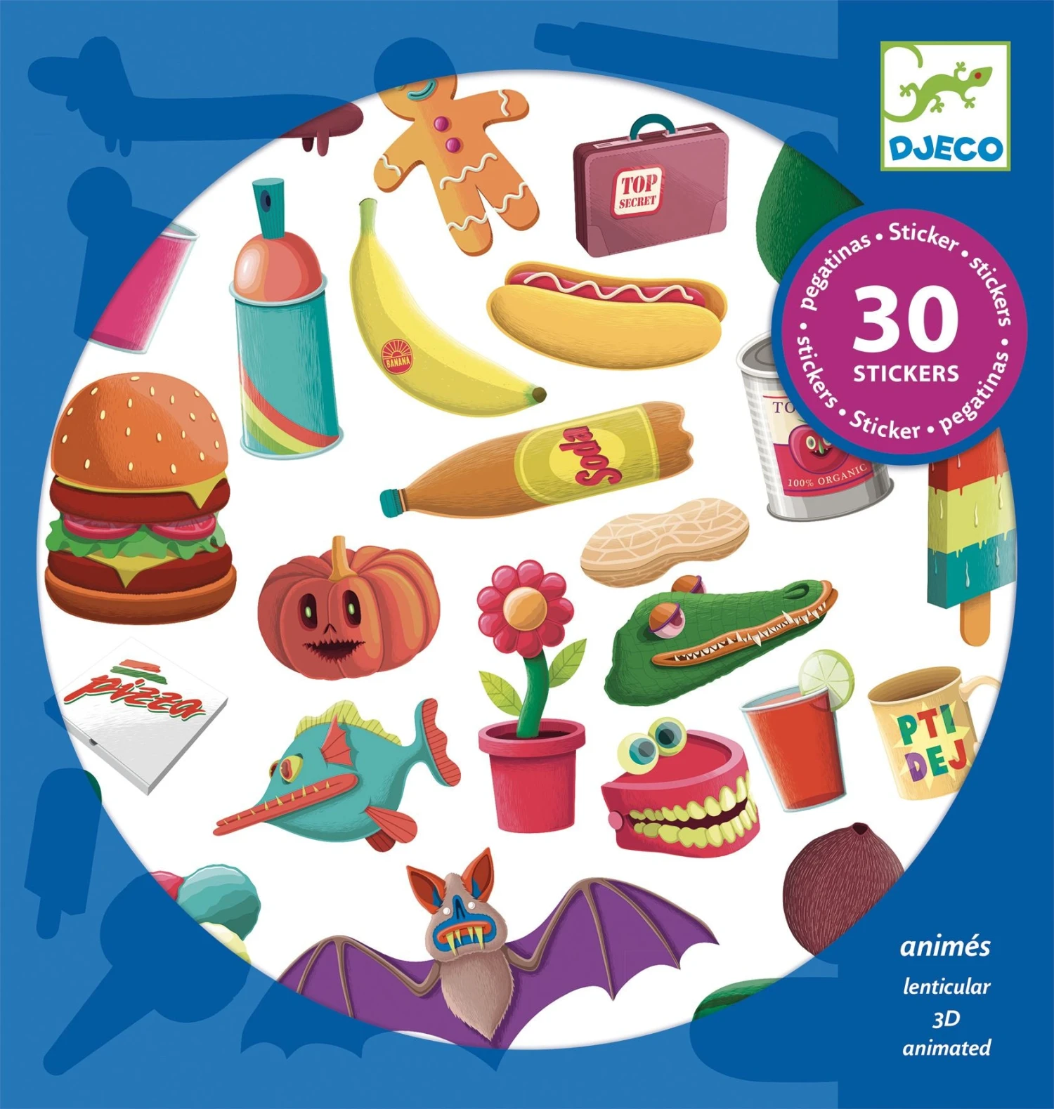 De stickers met etenswaren, dieren en grappige objecten zijn niet wat je op het eerste gezicht denkt! De hotdog lijkt een normaal broodje met een worstje, maar door het 3D effect zie je dat het worstje een gezicht heeft. En kijk eens goed naar het koekmannetje?