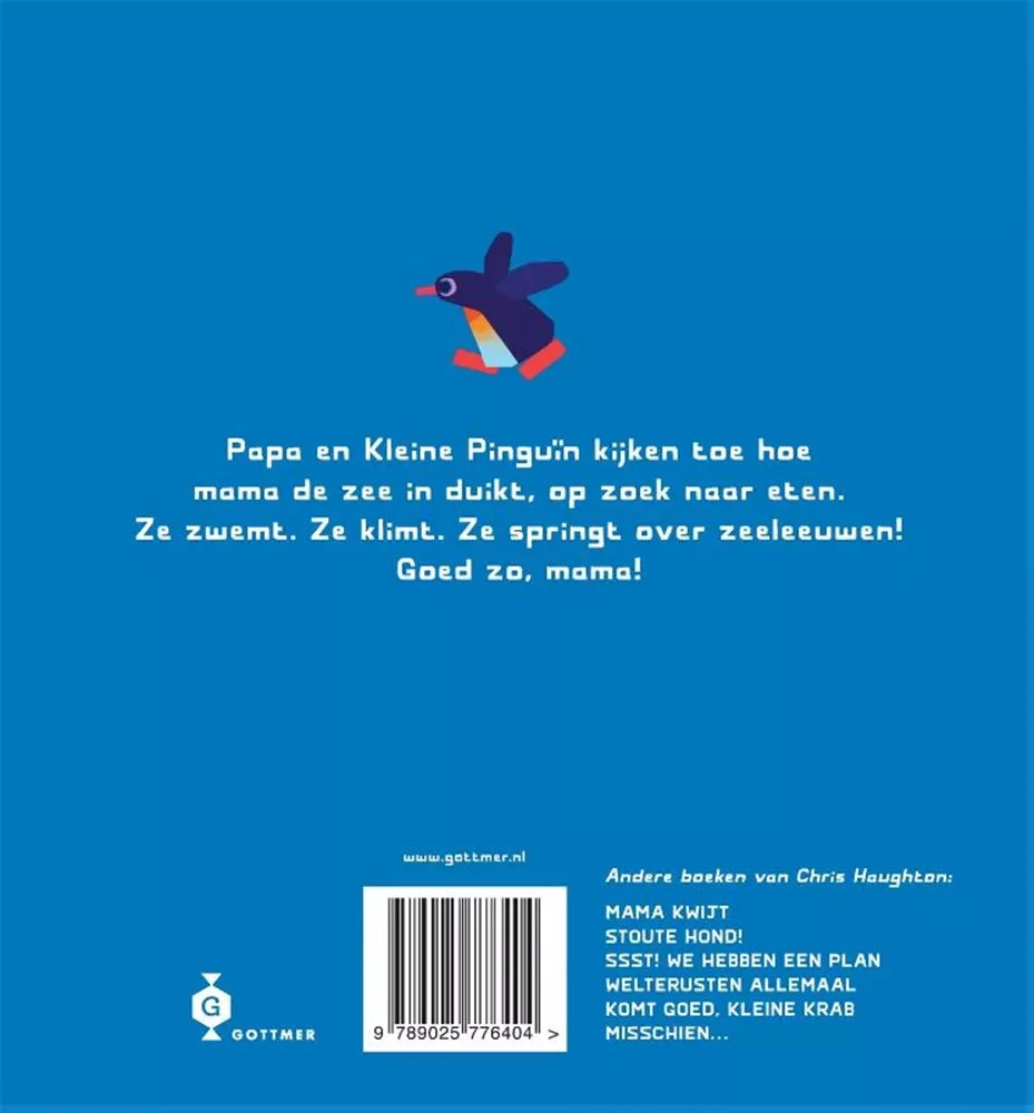 Goed zo, mama is een prentenboek voor kleuters vanaf 4 jaar geschreven en geïllustreerd door Chris Haughton. In dit kinderboek lees je het verhaal over het pinguingezin dat op zoek gaat naar een lekker visje. Terwijl papa pinguin en kleine pinguin aanmoedigen gaat mama op jacht!
