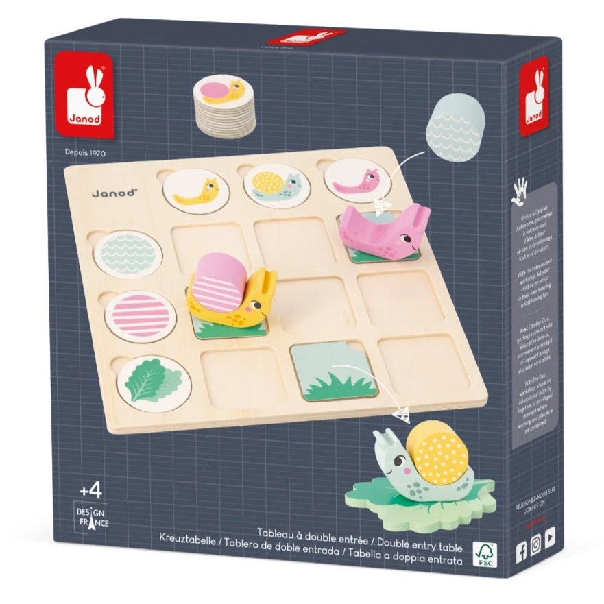 JANOD cijferspel uit de Pedagogie serie, een educatief spel voor peuters vanaf 3 jaar om spelenderwijs kennis te maken met tabellen en het logisch denken te stimuleren. Door de tabel goed te bekijken weet je welke slak je mag bouwen!