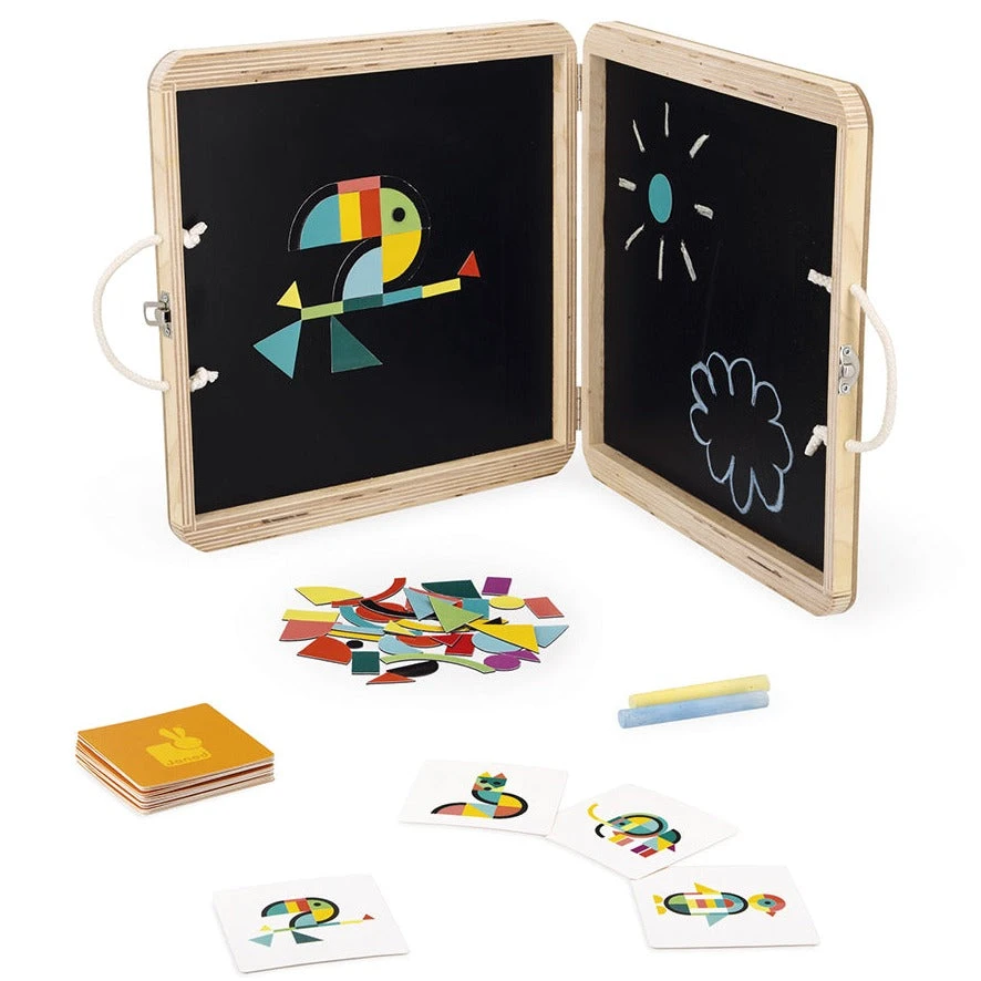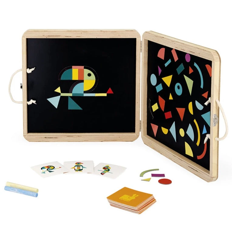 Het magnetische puzzelkoffer bevat 60 magneten, 20 voorbeeldkaarten en 2 krijtjes.Â