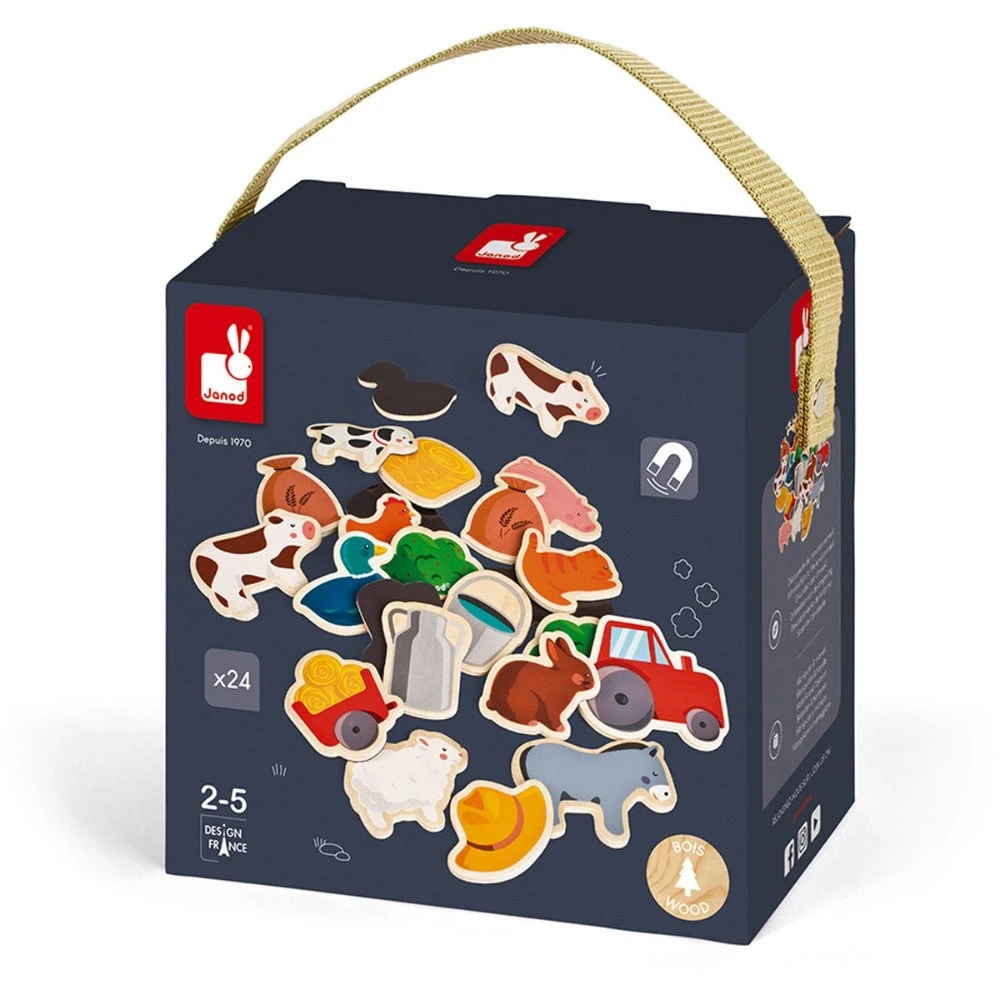 Houten JANOD magneten in boerderij thema, 24 magneten met dieren en alles wat je op en om de boerderij tegenkomt.