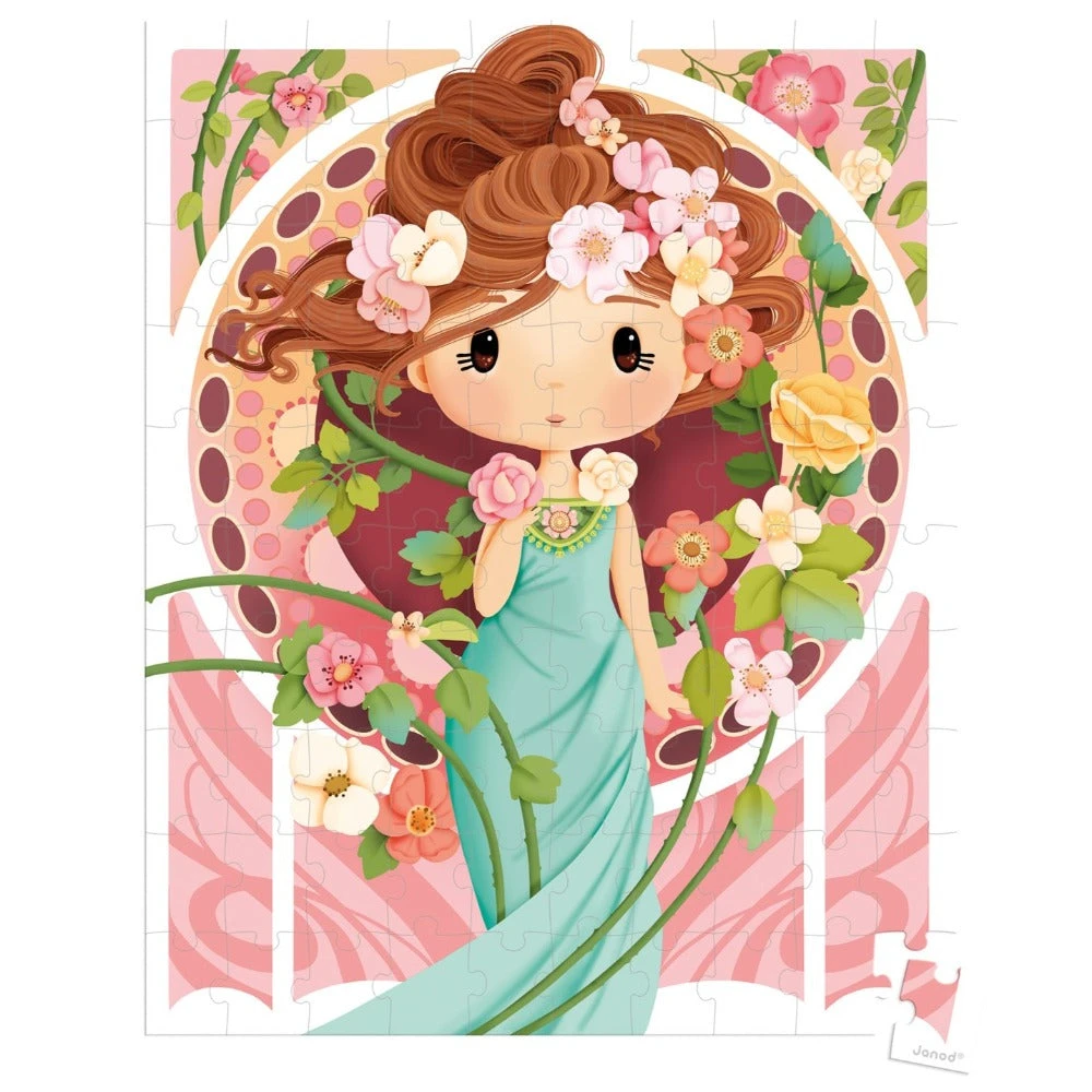 JANOD puzzel Mucha met een prachtig meisje, een puzzel voor kinderen vanaf 6 jaar. De kinderpuzzel heeft 100 stukjes en zit verpakt in een puzzelkoffer.