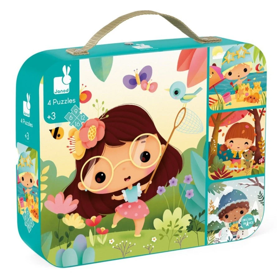 De puzzel van JANOD Seizoenen, 4 puzzels voor peuters vanaf 3 jaar. verpakt in een handige puzzelkoffer.