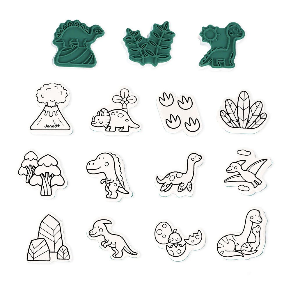 JANOD stempelset Dino uit de Stampinoo collectie, 15 verschillende peuter stempels + stempelkussen in dinosaurus thema Een leuke stempelset voor kinderen vanaf 3 jaar.