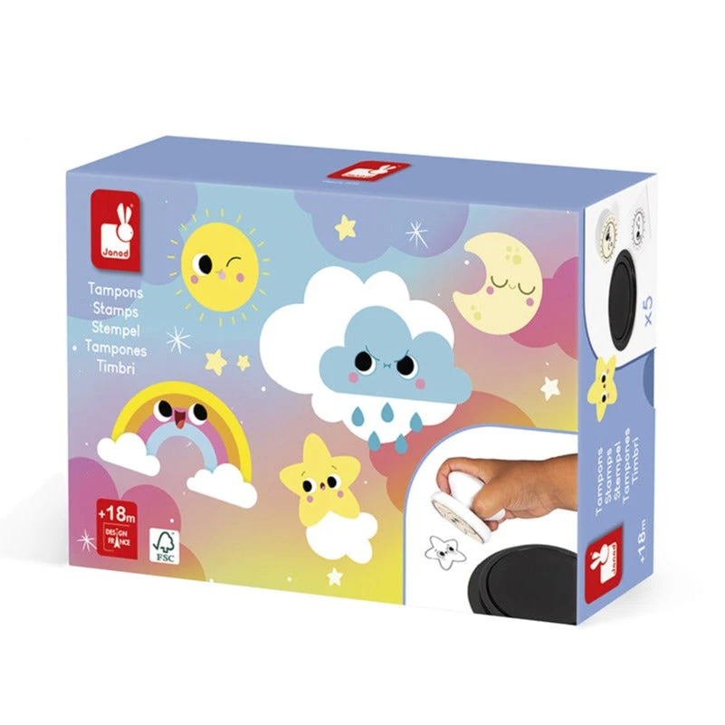 JANOD stempelset Dromenland uit de Stampinoo collectie, 5 peuter verschillende stempels met een ergonomische handgreep om de mooiste kunstwerken mee te maken. Ee leuke stempelset voor kinderen vanaf 18 maanden.Â