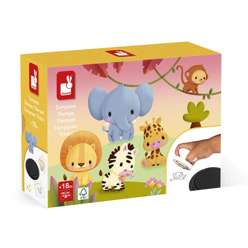 JANOD stempelset Savannah uit de Stampinoo collectie, 5 verschillende peuter stempels met een ergonomische handgreep om de mooiste kunstwerken mee te maken. Ee leuke stempelset voor kinderen vanaf 18 maanden.Â