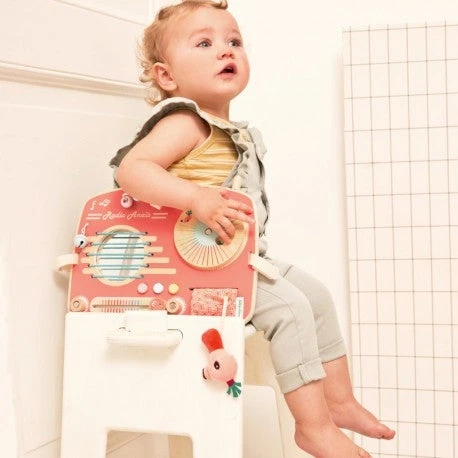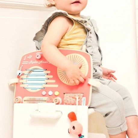 Lilliputiens radio activiteitenpaneel is uitdagend houten babyspeelgoed voor in de box. Geschikt voor baby’s vanaf 9 maanden.