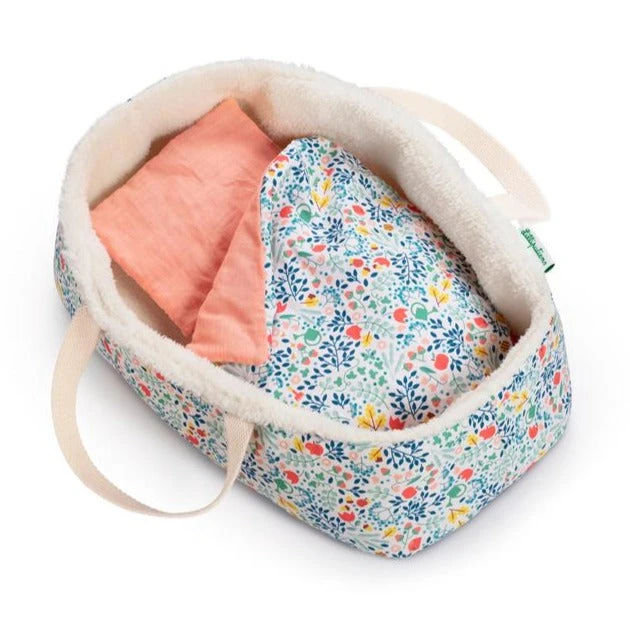 Lilliputiens reiswieg flowers, een stoffen poppenmandje om je Lilliputiens poppen en knuffels mee op pad te nemen. De reiswieg met bloemenrpint heeft een gevoerde binnenkant en hengsels om hem te dragen. In het poppenmandje zit een dekentje en kussentje op je poppen lekker onder te stoppen.