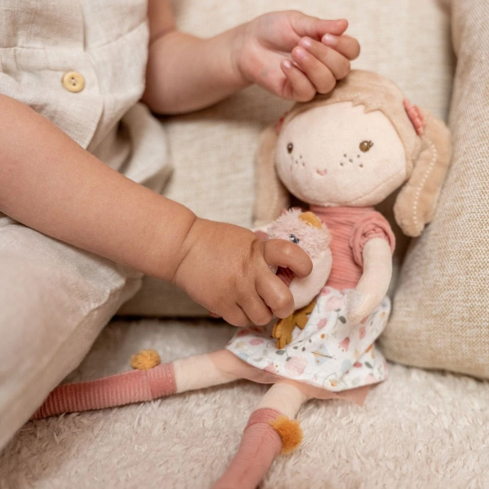 Little Dutch knuffel pop Anna is een zachte speelgoed pop van 35 cm voor kinderen vanaf 1 jaar. Anna heeft 2 staarten en sproetjes op haar wangen. Aan haar handjes zit klittenband waarmee ze het vogeltje stevig vasthoudt. Het vogeltje is los, het mooie gebloemde jurkje van Anna kan niet aan en uitgetrokken worden.Â
