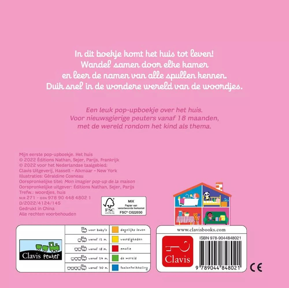 In dit pop-up kartonboekje maak je kennis met alles in en om het huis! Dit kartonboek is geschikt voor dreumessen en peuters vanaf 1 jaar.Â