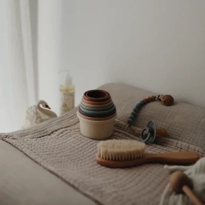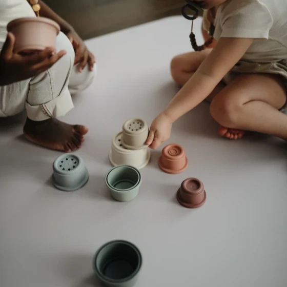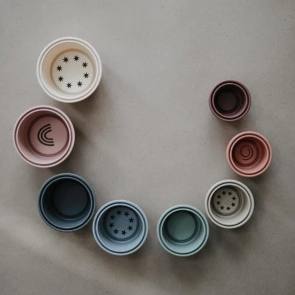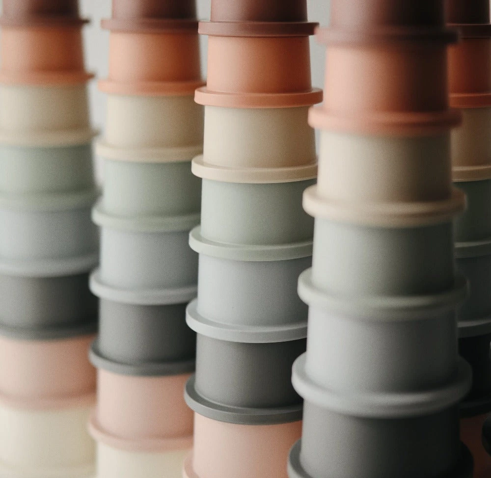 Mushie stapeltoren in zachte basic kleurtjes, een stapeltoren, stapelbekers en badspeelgoed in één. Babyspeelgoed voor in bad, op het strand of voor in de zandbak met een grote speelwaarde.