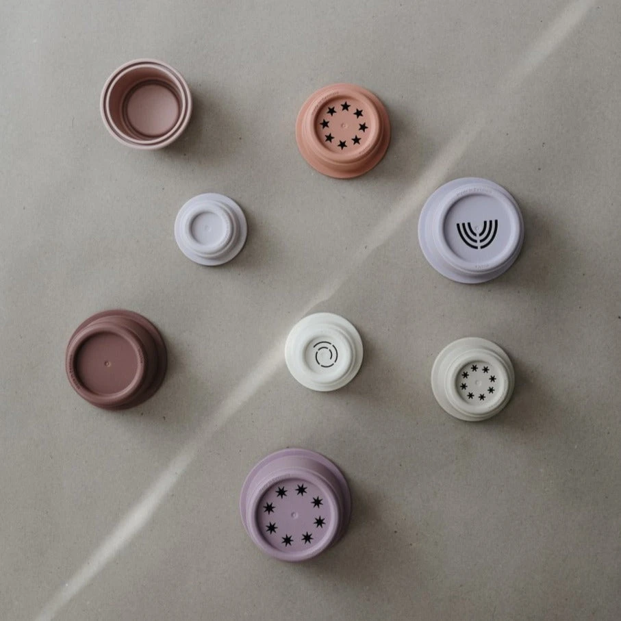 Mushie stapeltoren in poeder petal kleurtjes, een stapeltoren, stapelbekers en badspeelgoed in één. Babyspeelgoed voor in bad, op het strand of voor in de zandbak met een grote speelwaarde.