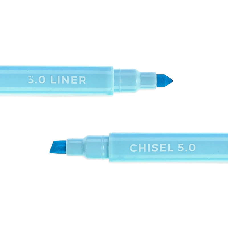 Deze 8 pastel stiften zijn aan 2 zijden te gebruiken. Ze hebben een markerkant van 5 mm en een scherpe punt van 3 mm. Hierdoor is de stift makkelijk te gebruiken als high lighter of markeer stift maar ook om details op je tekening in te kleuren.