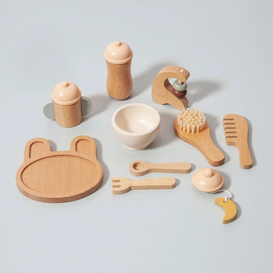 De set bestaat uit een bord met oortjes 10.7 x 11 cm, flesje van 9 x 4 cm, kommetje en bestek en een tuitbeker zodat de pop lekker kan eten. Een houten borstel met zachte haren, kam, rammelaar en speen met speenkoord maakt deze poppenverzorgingsset compleet.Â