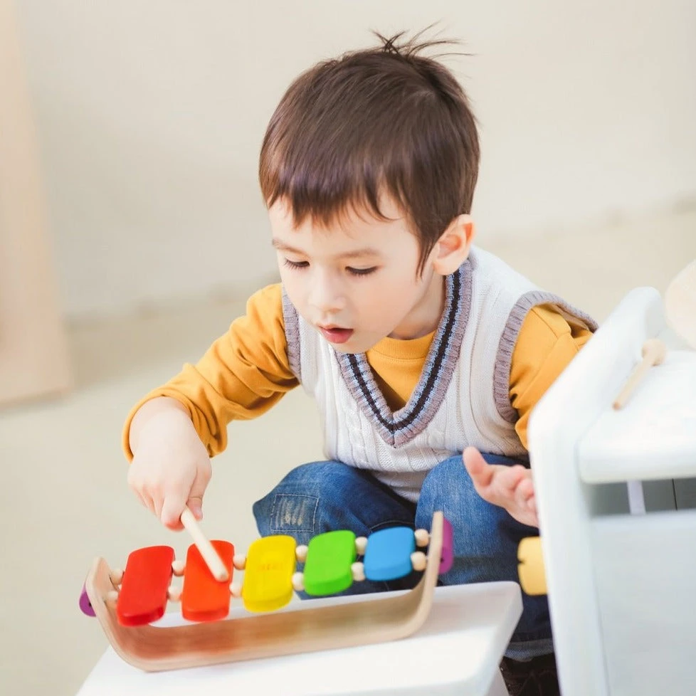 Plan Toys muziekinstrument xylofoon basic, de toetsen zitten aan elkaar verbonden met elastiek, hierdoor heeft de xylofoon een fijn geluid. Hard genoeg om mee te spelen, zacht genoeg voor de omgeving.Â